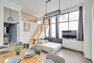 Located near Montparnasse, this pleasant two-story apartment is laid out as follows: