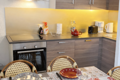 The accommodation is in a mountain cabin and has 2 rooms with 5 beds of the following type: 2 benches 70 cm wide and 2 m long, 1 double bed, 1 bunk bed (the bunk bed is not suitable for children under 6 years). It is fully equipped and will be perfect for a ski trip, with friends or family, with a capacity of up to 6 people. You will have a design kitchen open to a dining room, a bathroom, a beautiful living room and a furnished BALCONY, giving a pleasant view on the mountain.