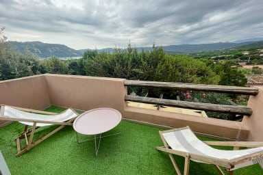 The accommodation is bright, charming, cosy and is composed of a bedroom with a double bed, a beautiful living room with one sofa bed, a shower and a balcony giving a breathtaking view, perfect for your vacations in Corsica. A shaded terrace, open on a garden is also accessible, you can enjoy it during the beautiful sunny days.