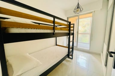 My apartment has two bedrooms with a double bed, a bunk bed and a crib, a shower room, a fully equipped kitchen and a living room with a dining area.