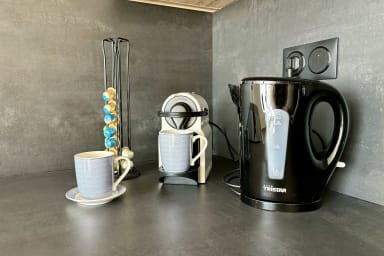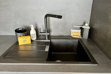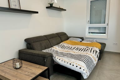 The flat has a cosy bedroom with a double bed, as well as a sofa bed in the living room, which can accommodate up to 4 travellers. Enjoy a modern, fully-equipped kitchen with oven, microwave, dishwasher and coffee machine for your breakfasts. There is also a washing machine, which is handy for longer stays.