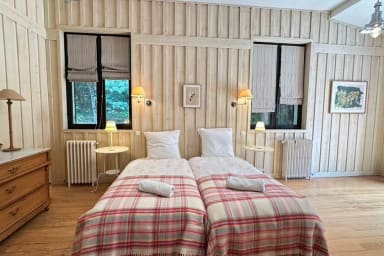 Single-story house with a living area of 300 m², comfortably accommodating up to 10 guests. It features five bedrooms: one with a 160 x 190 cm bed, a second with a 140 x 190 cm bed, a third with two 120 x 200 cm beds, and a fourth and fifth bedroom each with two 90 x 190 cm beds, as well as four bathrooms.