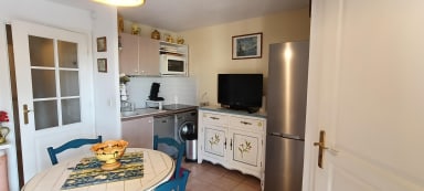Located on the 2nd floor with an elevator, this bright apartment enjoys a southwest orientation and a beautiful view. It is located in a secure, high-end residence (with cameras). It includes a bedroom with a double bed size 160 x 200, a fully equipped kitchen, and a functional shower room. The dining area is ideal for your meals, with a table and chairs, while the cozy living room has a size 140 x 190 convertible sofa, perfect for accommodating additional guests. You can also enjoy a balcony and a large terrace with direct views of the boats downstairs.