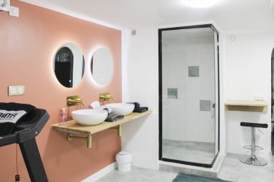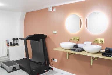 The living space opens onto a high-end, fully equipped kitchen with a refrigerator, oven, microwave, dishwasher, and coffee machine, as well as a raclette machine for cozy evenings. The spacious, renovated bathroom stands out for its unique design and integrated sports equipment, with a separate toilet for added privacy.