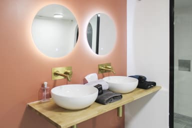 The sleeping area includes two stylish, newly renovated bedrooms, each with a 160 × 200 cm double bed for restful nights. One of the bedrooms also features a desk with a monitor. The large living room offers a high-quality 160 × 200 cm sofa bed, perfect for relaxing after a day of exploring.