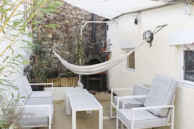 For year-round comfort, the home is equipped with air conditioning and a fan. You will also have a full range of amenities, including a washing machine, dryer, iron, and hairdryer. The main highlight is the private outdoor area with a garden, terrace, hammock, and barbecue—perfect for enjoying sunny days in the city.
