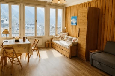 HostnFly vous propose ce charmant logement de 30 mètres carrés, situé à Chamonix et offrant une VUE époustouflante sur le MONT-BLANC et la ville.