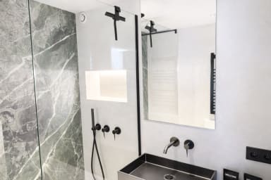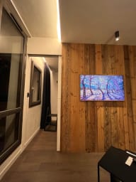 Machine à café Nespresso, Lave-vaisselle 6 couverts, Wifi, Micro-onde et Four combiné, Plaque à induction, Sèche-serviettes, Sèche-cheveux, Porte-savon noir, Radiateur sèche-serviettes, Raclette de douche, Brosse WC plastique blanc, Fer à repasser, Télévision, Grille-pain, aspirateur Dyson, appareil à raclette, Bouilloire, Local à ski.