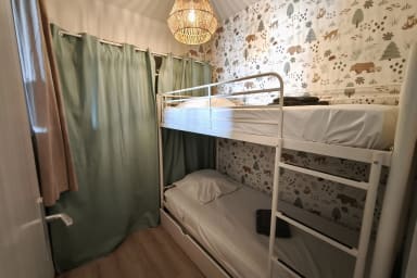 - une chambre avec vue sur le salon contenant un lit superposé ;