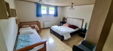 - une chambre avec un lit double et deux lits simples (lit gigogne) avec 1 lit Bébé (matelas, chaise haute, table à langer) ;