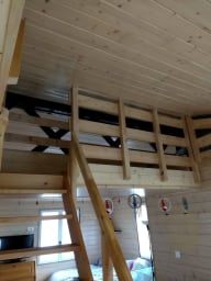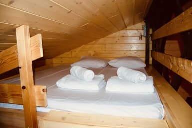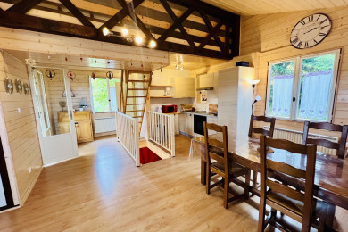 Dans ce charmant petit chalet, vous trouverez une chambre avec un lit double, idéale pour un repos confortable. Un lit superposé est également disponible, offrant 2 lits simples pour accueillir plus de personnes. Le salon dispose d'une mezzanine ouverte, accessible par un escalier, où vous trouverez un lit double pour un espace de couchage supplémentaire.