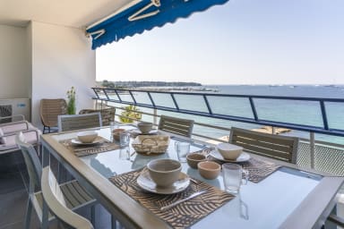 L'un des atouts du logement est sa localisation. Il est situé à 50 mètres de la plage, avec vue sur le massif de l'Estérel et sur les îles de Lérins ainsi que le Cap d'Antibes.