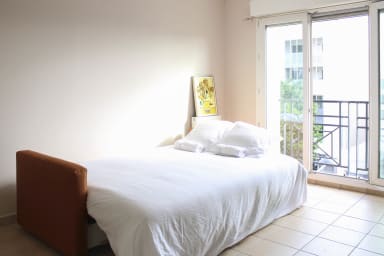 un salon avec canapé convertible donnant accès à un balcon lumineux.