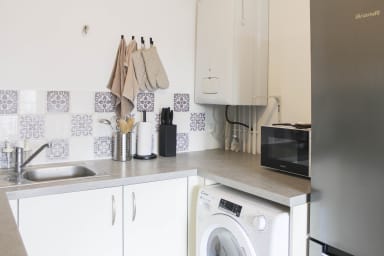 de nombreux équipements pratiques : lave-linge, lave-vaisselle, four, micro-ondes, machine à café Senseo, bouilloire, fer à repasser, sèche-cheveux, ventilateur, etc.