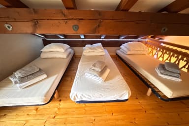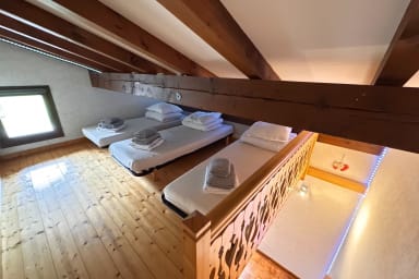 Confortable et chaleureux, il dispose d’une chambre en mezzanine avec trois lits simples 90x190, offrant un accès direct au salon équipé d’un canapé convertible 140x190.
