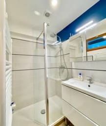La salle d’eau moderne et fonctionnelle comprend une douche récente, idéale pour un moment de détente après vos visites ou votre travail. Vous y trouverez également tout le nécessaire pour vous préparer confortablement.