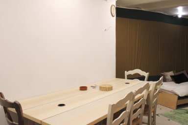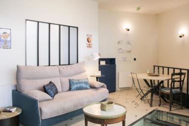 Un salon convivial avec canapé convertible (2 places) et coin repas ou espace de travail.