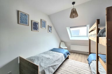 Vous disposerez de quatre chambres confortables : une chambre avec un lit double de taille 140 x 190, une deuxième chambre avec un lit double de taille 140 x 190, une troisième chambre avec un lit double de taille 140 x 190, et enfin une dernière chambre avec un lit simple de taille 90 x 190 ainsi qu’un lit superposé de taille 90 x 190.