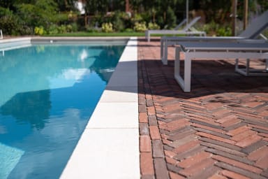 Depuis la magnifique terrasse en bois, profitez d’une vue imprenable sur les espaces extérieurs et la piscine.