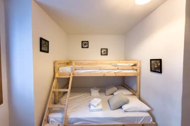 Il dispose de quatre chambres accueillantes : deux chambres avec des lits doubles de taille 160 x 200, une troisième chambre équipée d’un canapé-lit de taille 160 x 200, et enfin, une quatrième chambre avec un lit superposé adulte de 3 places (140 x 190 en bas et 90 x 190 en haut).