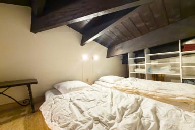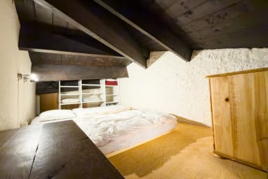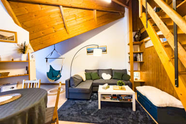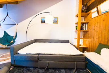 Le logement comprend un coin nuit en mezzanine avec deux lits 90x190, des matelas au sol pour un confort optimal, ainsi qu’un salon équipé d’un canapé convertible 160x200, idéal pour se détendre après une journée de balades.