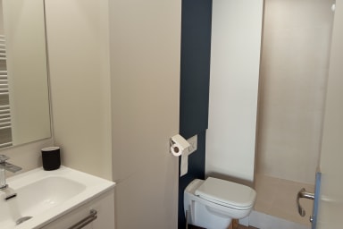 La cuisine est entièrement équipée, avec lave-vaisselle, machine à café, réfrigérateur, four et micro-ondes, pour préparer vos repas en toute simplicité. La salle de bain moderne et les équipements pratiques comme le sèche-cheveux et l’aspirateur complètent le confort du logement.