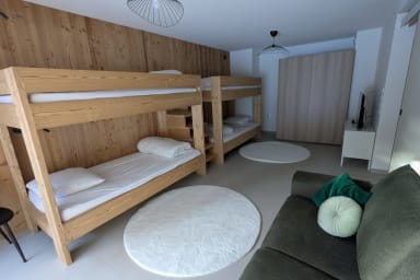 Le couchage se répartit en quatre chambres comprenant trois lits doubles de 160x200, un dortoir avec quatre lits simples superposés de 90x200 et un canapé convertible de 140x200 dans le salon. Une chambre dispose de son propre balcon et une autre de son coin WC privé.