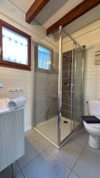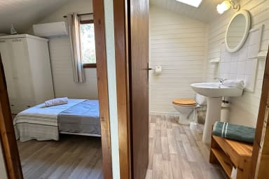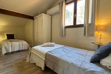 Le chalet est entièrement climatisé et propose des équipements complets tels qu'une machine à café, un lave-linge, un fer à repasser, un sèche-cheveux et une place de parking privé pour votre véhicule.